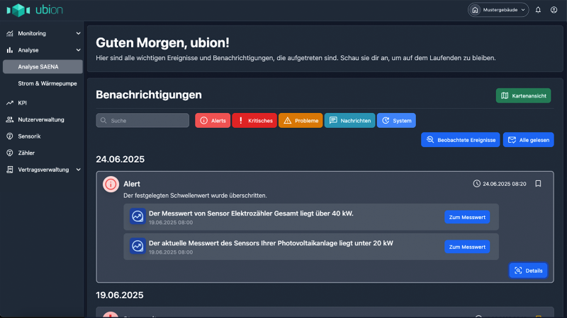 Der Assistent verdichtet alle energetischen Kennzahlen Ihrer Liegenschaften zu klaren Dashboards – sekundenschnell, ohne langes Suchen. Unser Machine-Learning-Modell filtert Abweichungen, Einsparpotenziale und kritische Trends heraus und liefert täglich oder nach Wunsch kompakte E-Mail-Zusammenfassungen. Push-Benachrich-tigungen folgen bald, sodass Sie stets bestens informiert sind.